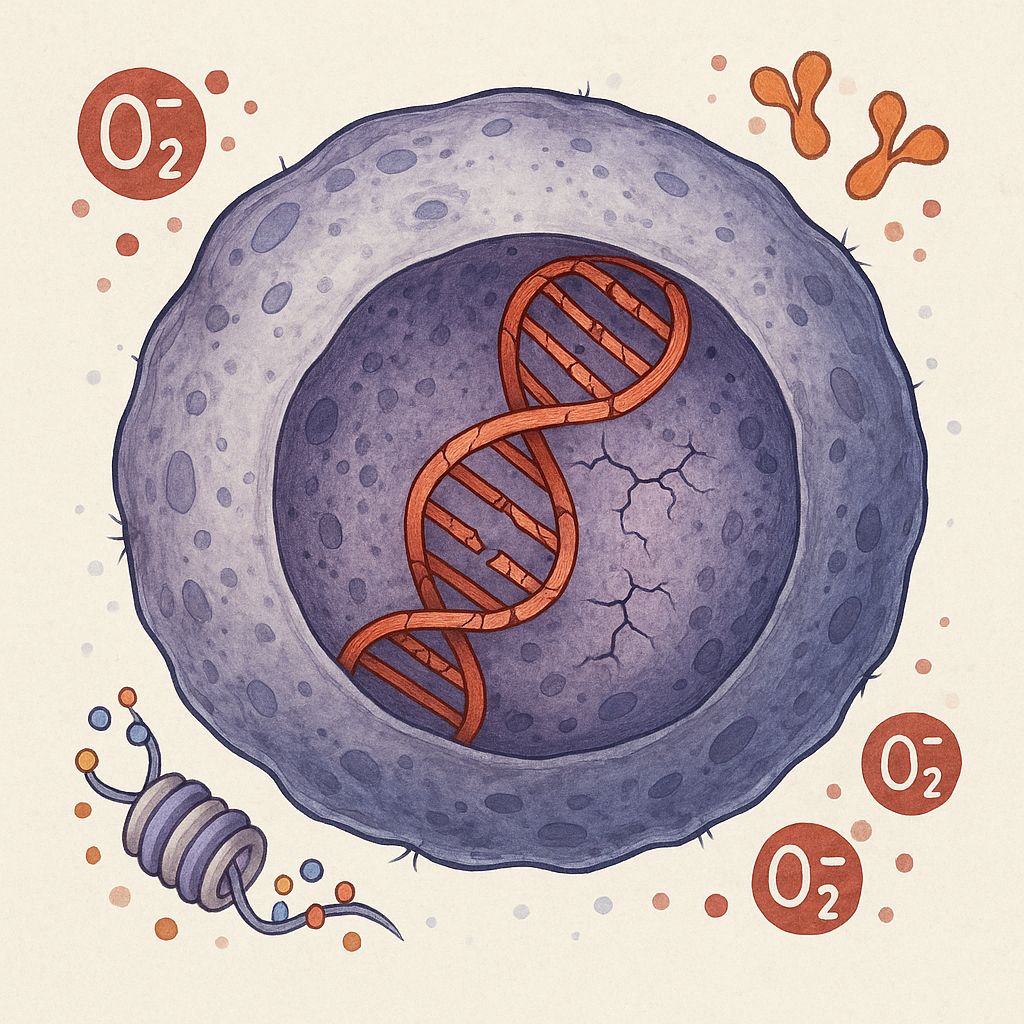 줄기세포 내부에서도 시간의 흔적이 깊게 남는다. 분열을 거듭하는 동안 DNA에는 크고 작은 손상이 축적되고, 텔로미어는 조금씩 짧아진다. 젊을 때는 DNA 복구 시스템이 대부분의 문제를 해결해 주지만, 반복되는 스트레스 앞에서 복구 효율은 점차 떨어진다. 손상이 너무 심해지면 p53 같은 감시자가 작동해 세포주기를 멈추거나 세포사멸을 유도하는데, 줄기세포가 이런 '방어적 멈춤' 상태에 들어가면 숫자는 존재하지만 실제로는 기능을 수행하지 못하는 경우가 많다. 외형상으로는 줄기세포 수가 크게 줄지 않았더라도, 현장에서 일할 수 있는 실전 병력은 감소하는 셈이다.
