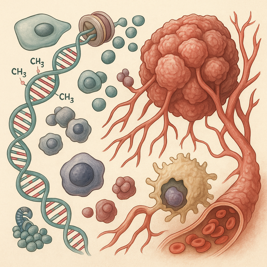 암은 개별 세포만의 문제가 아니라, 주변 환경 전체가 변형되는 현상이기도 하다. 종양 주변에는 혈관, 섬유아세포, 면역세포, 염증 매개 물질이 복잡하게 얽힌 종양 미세환경이 형성된다. 원래 상처가 나면 면역세포가 들어와 손상 부위를 청소하고, 성장 인자가 분비되어 재생을 돕고, 혈관이 새로 자라면서 회복이 진행된다. 하지만 종양에서는 이 과정이 끝나지 않고 계속 이어진다. 혈관 신생 신호가 끊임없이 나오면서 비정상적인 혈관이 덩어리처럼 자라고, 일부 면역세포는 암세포를 공격하기보다 성장 인자와 사이토카인을 제공해 종양을 지지하는 쪽으로 방향을 바꾼다. 마치 '상처가 영원히 아물지 않는 상태'가 된 것이다. 재생 프로그램이 종료 신호를 받지 못한 채 켜져 있는 상처, 그것이 종양이라는 비유가 나오는 이유다.